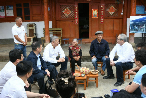 6月2日,陳春聲書記、羅俊校長一行在鳳慶縣鳳山鎮(zhèn)紅塘村與楊光順老人及老伴親切交談 攝影:金鳳
