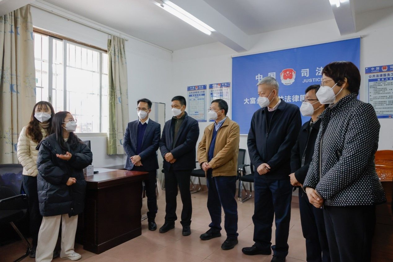 隨后,調(diào)研組走進集“黨建、法治、文化、產(chǎn)業(yè)”四位一體打造的大富頭村,先后參觀了大富頭村法治公園、黨建活動中心、公共法律服務(wù)室、圖書閱覽室和共富坊,聽取了大富頭村建成廣東省民主法治示范村,通過村集體領(lǐng)辦馬蹄合作社,帶動村民共同致富的模式報告。