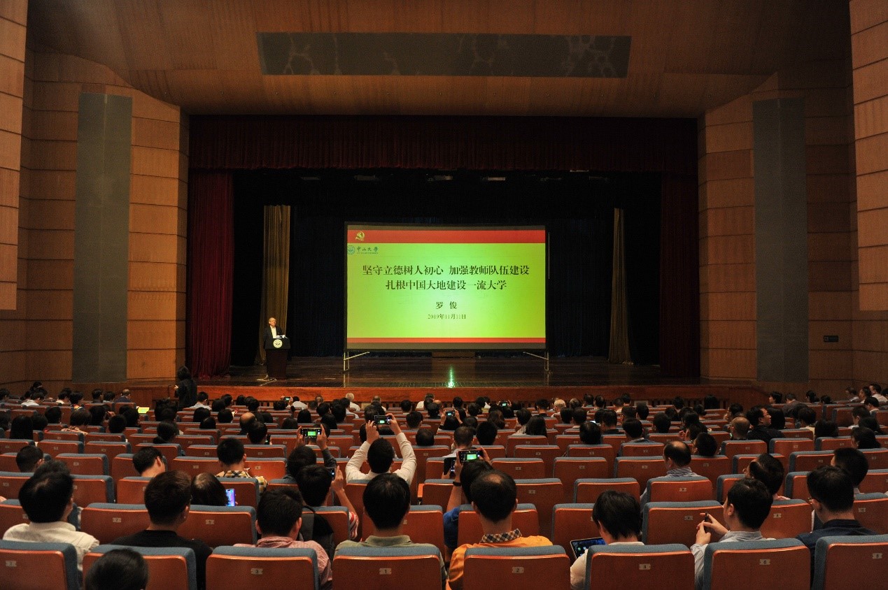 11月11日上午,我校在廣州校區(qū)南校園梁銶琚堂舉辦中山大學(xué)“不忘初心、牢記使命”主題教育專題黨課,校黨委副書記、校長羅俊講授“堅守立德樹人初心 加強(qiáng)教師隊伍建設(shè) 扎根中國大地建設(shè)一流大學(xué)”專題黨課。專題黨課由校黨委書記陳春聲主持。