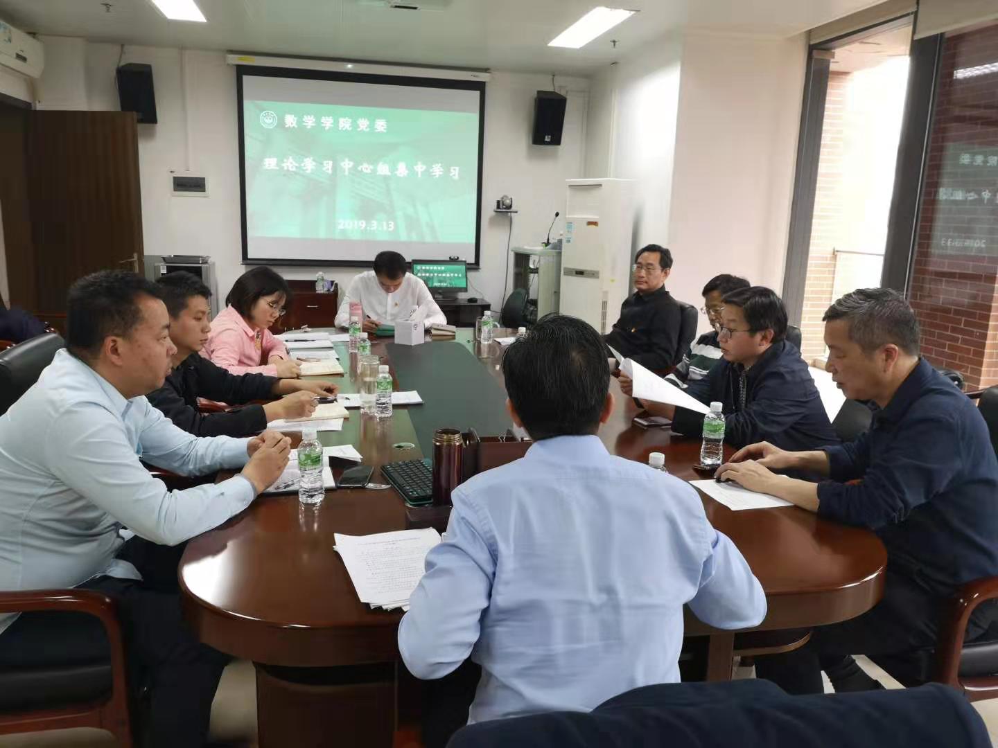 數學學院黨委堅持將政治理論學習作為學院黨政聯席會議的“第一議題”,認真組織好學院黨委理論學習中心組的集中學習,為學院黨委委員購買理論書籍、鼓勵黨員干部加強自學,帶領學院黨員干部深入學習貫徹習近平新時代中國特色社會主義思想,教育引導黨員干部樹立“四個意識”,增強“四個自信”,做到“兩個維護”,在思想上政治上行動上始終同以習近平同志為核心的黨中央保持高度一致。