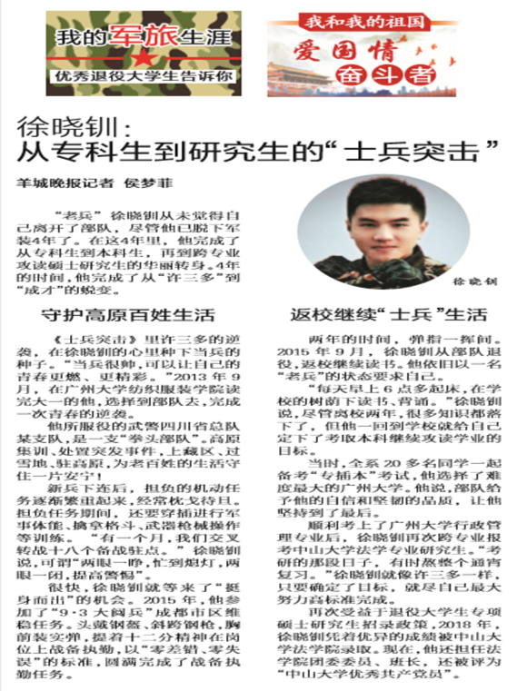 在中山大學“立德樹人”的人才培養氛圍中,徐曉釧始終堅持學習貫徹習近平新時代中國特色社會主義思想,堅定理想信念、錘煉品德修為。雖然脫下軍裝已經四年,但他依舊以“老兵”的狀態要求自己,困知勉行,實現了從專科生到研究生的“士兵突擊”。其鍥而不舍馳而不息的求學事跡在省、市征兵動員儀式上作為典型宣傳,還被《羊城晚報》、廣州電視臺等媒體報道。在法學院,他不僅在一年內超額修完學分,還補修法學本科基礎課程,經常泡圖書館廣泛閱讀,踴躍參加學術研討會和講座,積極參加導師的課題研究……腦子里繃緊學習之弦,如饑似渴、孜孜不倦學習。他在游泳、登山、拳擊、打羽毛球和跑馬拉松等文體活動中強身健體、發展興趣,在法學院運動會男子3000米跑中勇爭潮頭奪第一……他努力提升德智體美勞全面發展的綜合素質,在中山大學“雙一流”建設中,同新時代追夢前行!