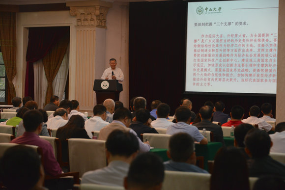 會上,陳春聲書記作了題為“在新的起點上再創新局”的輔導報告。他首先傳達了習近平總書記對廣東工作的重要批示和全省市廳級主要領導干部學習貫徹習近平總書記重要批示精神專題研討班會議精神。他指出,要充分認識習近平總書記重要批示的重大意義,從廣東發展的關鍵時刻看,習近平總書記的重要批示是廣東改革發展進程中具有里程碑意義的大事;從廣東發展戰略的全局看,重要批示是統領全省工作的重要指針和行動指南;從與實踐結合的角度看,重要批示是總書記治國理政新理念新思想新戰略在廣東的展開和具體化,是實事求是運用中國特色社會主義理論指導發展實踐的光輝典范。貫徹落實習近平總書記重要批示,核心在于深刻把握習近平總書記重要批示的精神實質,其中,“四個堅持”是廣東改革發展的旗幟和原則,“三個支撐”是廣東的使命擔當和發展路徑,“兩個走在前列”是廣東改革發展的奮斗目標。三者有機聯系,相輔相成,層層遞進,集中體現了對馬克思主義立場觀點方法的自覺運用,具有很強的科學性、真理性、指導性。