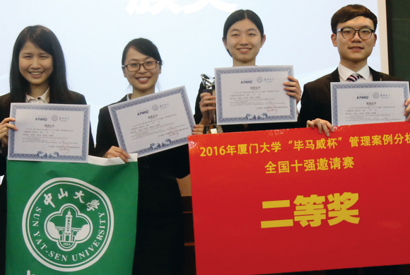 由管理學院學子張夢瑜、華恩迪、黃星銘和邵迅機組成的中山大學代表隊,在2016年“畢馬威杯”管理案例分析全國十強邀請賽中榮獲亞軍,邵迅機同學更是以優異的表現獲得“最佳選手”稱號,本次帶隊和指導老師為管理學院會計學系教師張俊生副教授。
