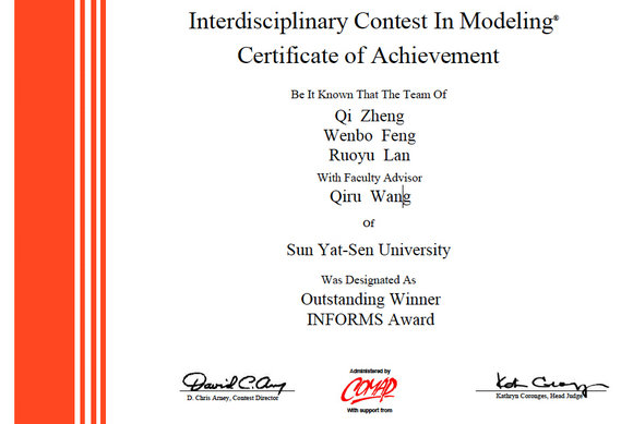 近日,2016年美國大學生數學建模競賽(MCM/ICM)評審結果正式公布。我校三個隊伍在F題的競爭中脫穎而出,進入決賽。最終,來自大氣科學學院、嶺南學院、以及數據科學與計算機學院的藍若瑜、馮文伯、鄭齊三位同學的論文榮獲特等獎(Outstanding Winner),并由全球最大的運籌與管理科學協會INFORMS授予唯一的最高榮譽INFORMS獎。其余兩個分別由物理學院和數據科學與計算機學院選手組成的隊伍獲得特等獎提名獎(Finalist)。這是我校自2010年連續七年獲得特等獎提名獎,并首次在該賽事登頂。