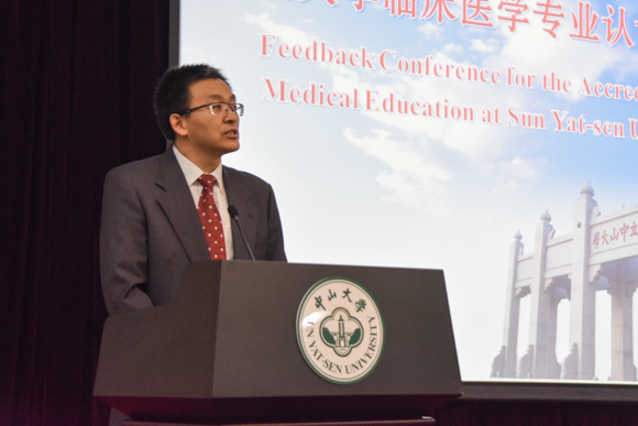 王維民教授最后講話。他說,幾天來,認證小組為中山大學師生員工的敬業精神所感動,被中山大學深厚的歷史積淀和人文氛圍所感染。在不斷的探索與創新中,中山大學遵循醫學教育標準,逐步完善醫學培養模式;勇于擔當的學校和醫學院領導,無私奉獻、踏實教學的老師們,誠實自信、尊師樂學的同學們,都給認證小組留下了深刻的印象。他再次代表認證小組對學校、各附屬醫院及服務于本次認證的工作人員表示感謝,期待中山大學繼續關注醫學教育發展趨勢,在未來的教育教學,尤其是醫學教育中,不斷進取,取得更多成績。