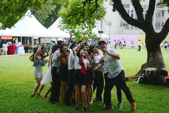 七月的康園,畢業生們盡情玩狂拍,看,自拍桿玩得好high!(董柏宏 攝)