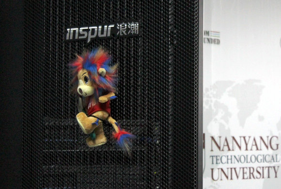 新加坡南洋理工大學首次參加國際大學生超算競賽,在初賽中以海外總成績第一而挺進總決賽。新加坡的多元文化成就了國際化的參賽隊伍,隊員們分別來自新加坡、印度、中國、越南等國家。在機柜上,一只身著“NTU”服飾的毛絨獅子玩偶默默支持著神色緊張的隊員們。原來,獅子是南洋理工大學的吉祥物,獅子玩偶也是從校徽上的獅子演變而來的,隊員開玩笑說“獅子已經從校徽上的四腳行走進化成兩腳站立了”。