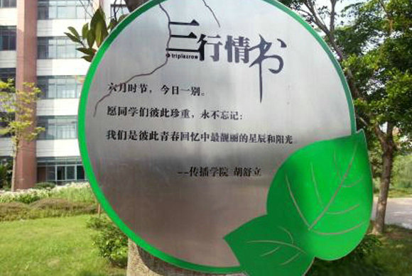 樹木無情人有情,東校區(qū)圖書館側(cè)面斜坡的每一棵行道樹上,都懸掛著一個(gè)銘寫著“三行情書”的金屬牌。“三行情書”是傳播與設(shè)計(jì)學(xué)院舉辦的特色活動(dòng),三行文字言短情濃。