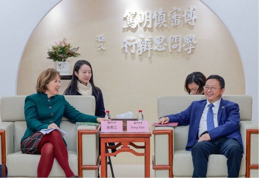 高松校長代表中山大學歡迎吳若蘭大使的到訪,并介紹了我校辦學格局、人才培養、科學研究和國際合作交流等情況。他指出,我校已與10多所英國高校在人才培養、師生交流、科研合作等領域開展了良好的合作,合作領域涉及醫學、地理、經濟、語言、化學、政務、法學、旅游學、計算機學等多個領域。我校期望與英國高校繼續加強合作與交流,共同打造開放共享的合作平臺,面向全球重大科學問題,共同推進科學前沿探索,為全球發展貢獻更多解決方案。明年是中大百年校慶,歡迎英國高校的同仁屆時來校訪問交流。
