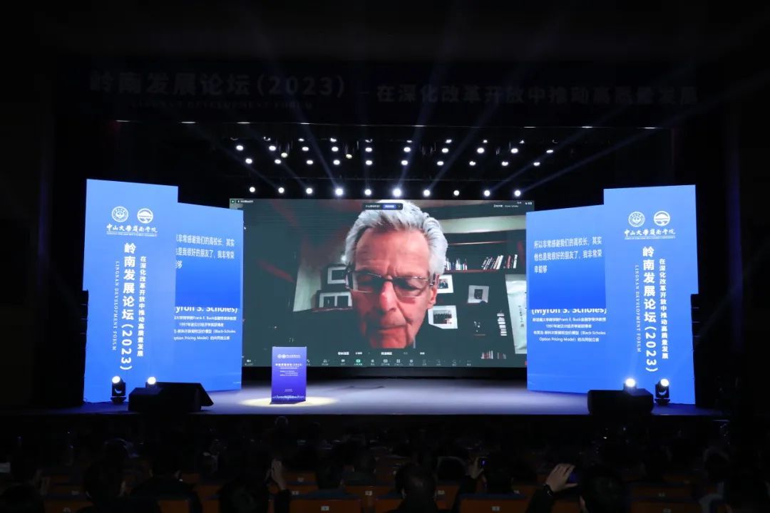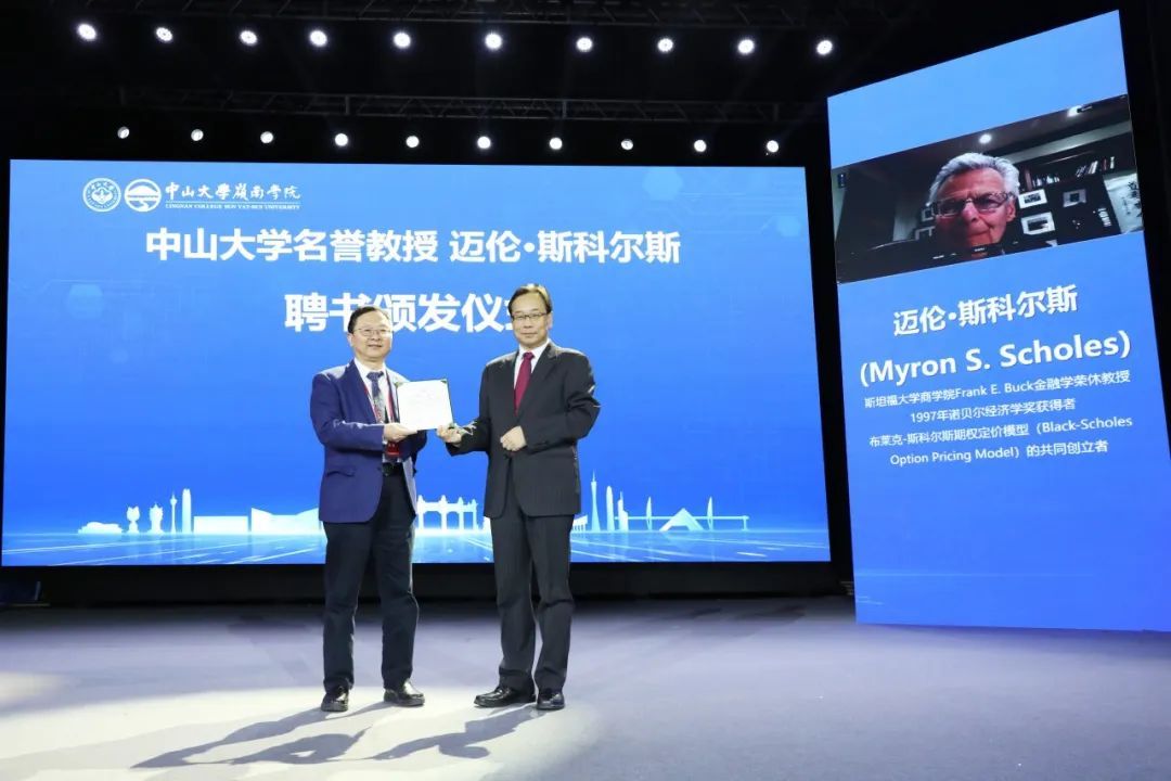 在與會領導與嘉賓共同見證下,中山大學校長高松院士向線上參會的邁倫·斯科爾斯教授頒發中山大學名譽教授聘書,由趙昌文教授代領聘書。