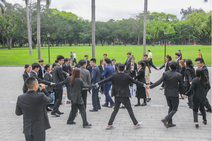 跟隨馬英九到訪中大的,還有20位臺灣青年。“轉個圈圈就認識了你”,一個游戲“音樂同心圓”,中山大學的學生和遠道而來的客人很快破冰,互相交換了聯系方式,互贈禮物。