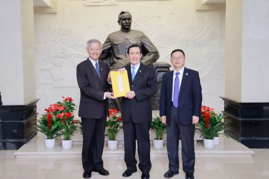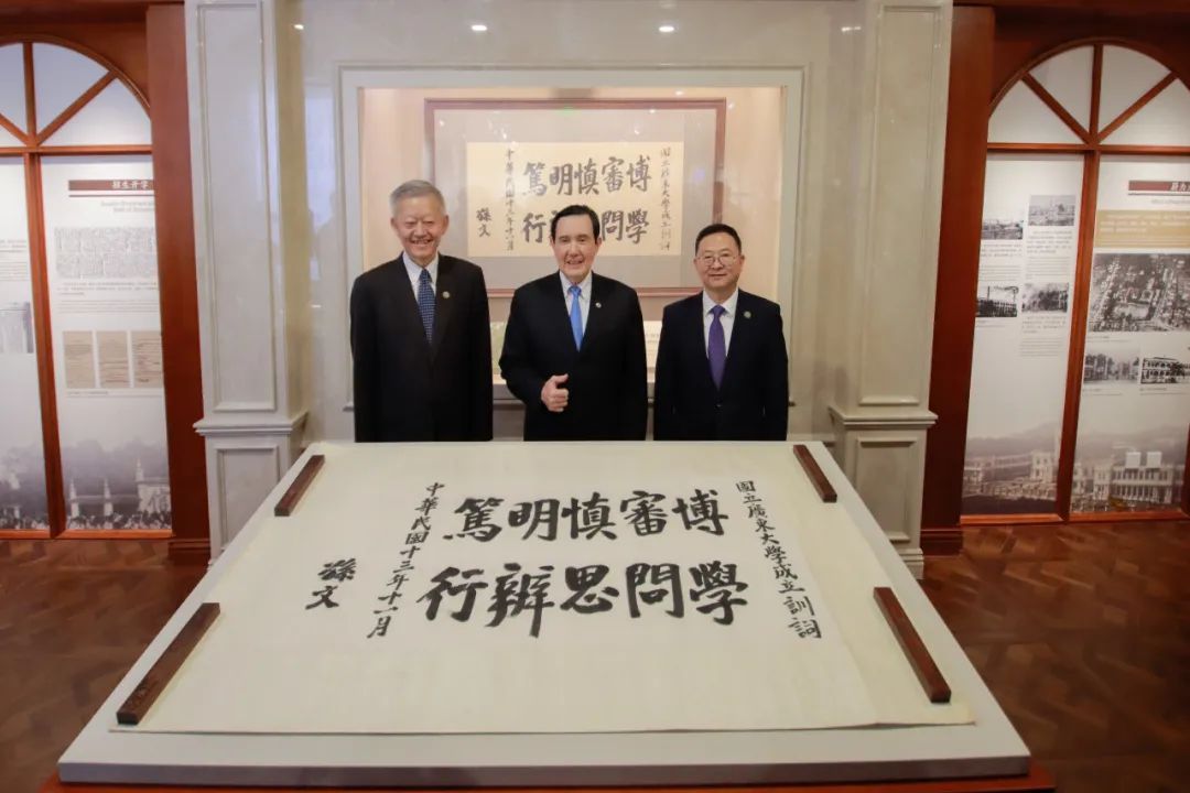 馬英九在孫中山先生手書訓詞的原稿前與中山大學黨委書記陳春聲、校長高松合影留念