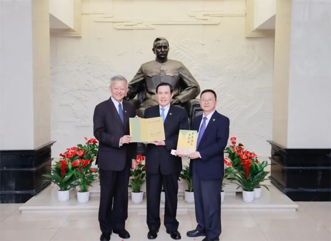 參觀結束后,陳春聲、高松向馬英九贈送書籍《孫中山與中山大學》,書籍記載了孫中山先生創辦國立廣東大學的命令、指令、訓令等有關文件。馬英九回贈《中華語文大辭典》和馬氏家訓書簽。