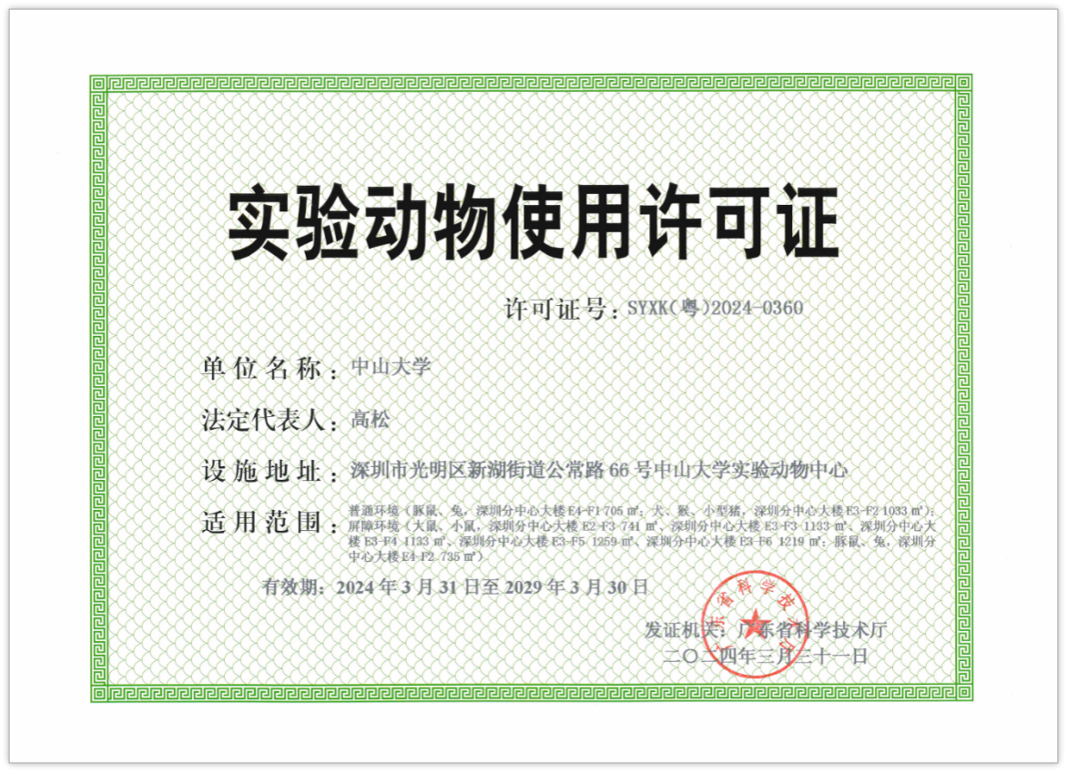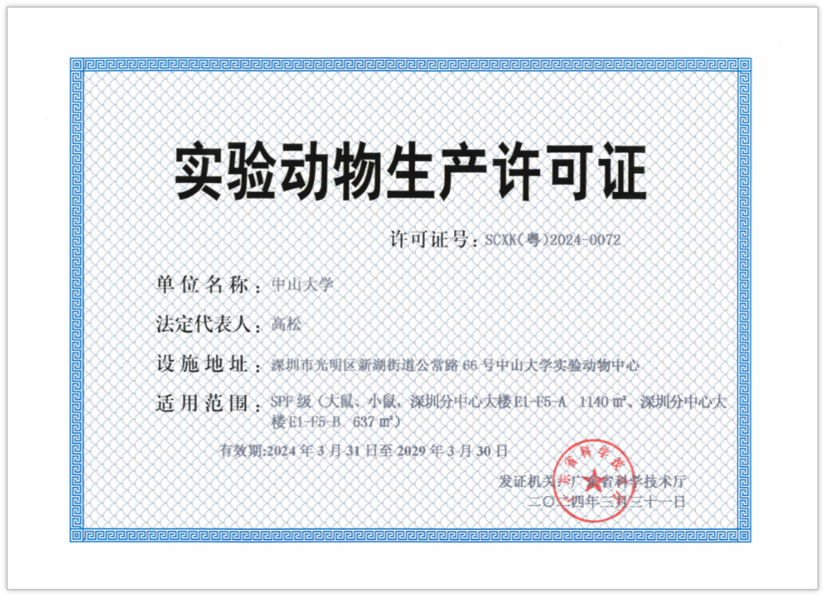 深圳分中心實驗動物設施順利獲得廣東省科技廳頒發的實驗動物生產和使用許可證,表明該設施符合國家實驗動物環境設施標準,管理制度及SOP操作規程、實驗技術團隊人員滿足相關管理要求,具備生產SPF級大小鼠資質,具備飼養SPF級大小鼠、豚鼠、兔以及普通級豚鼠、兔、小型豬、犬、猴等實驗動物和開展相關動物實驗的資質。