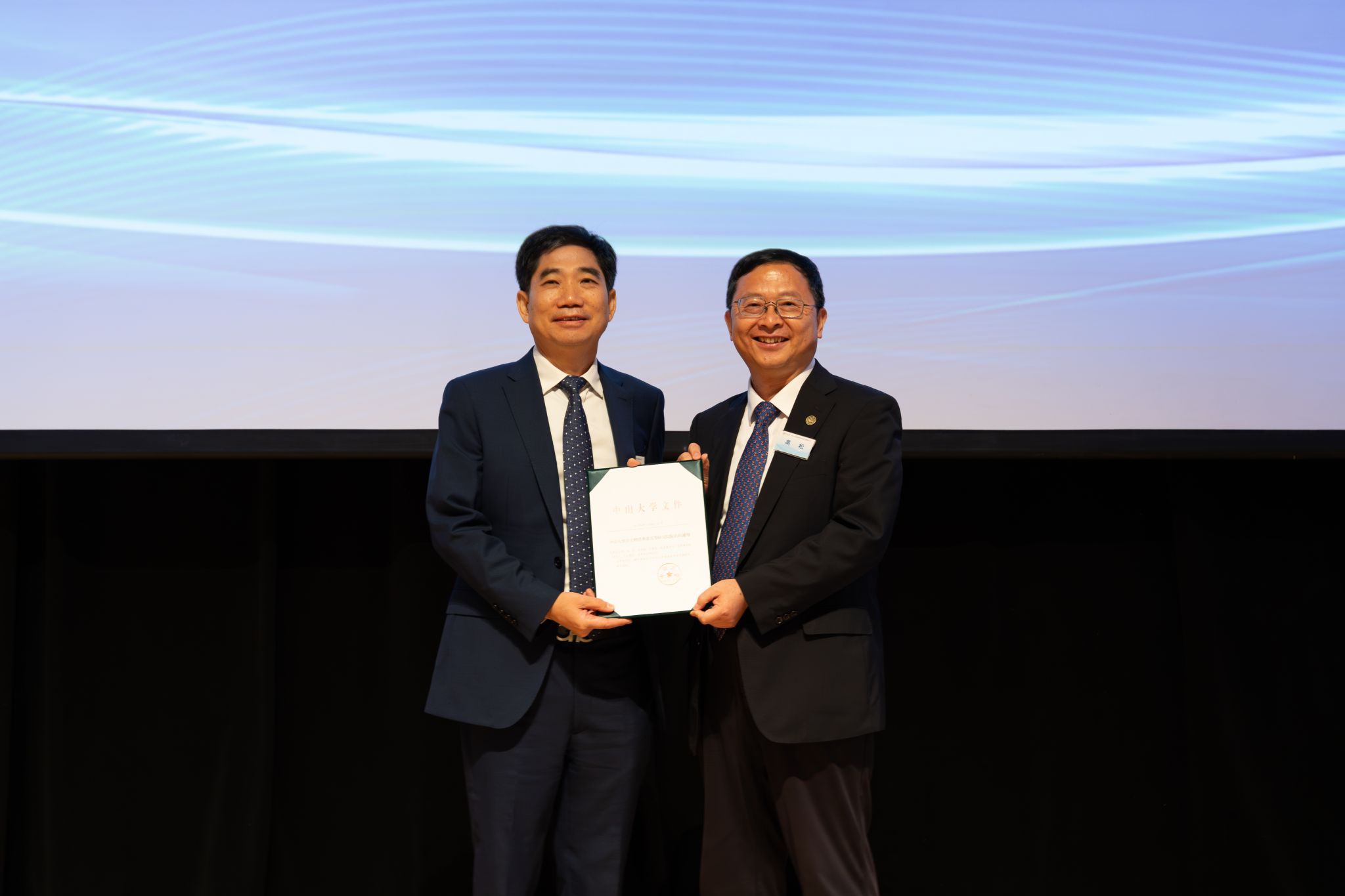 高松校長為香港高等研究院院長徐安龍教授頒發聘任證書。