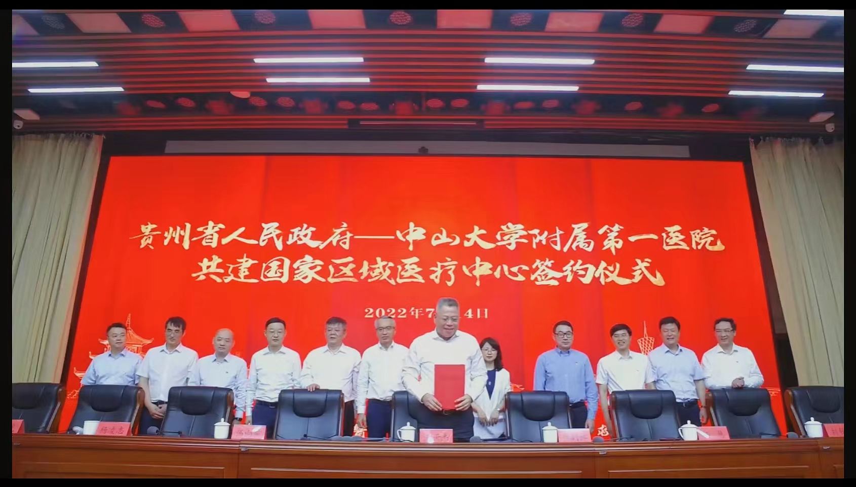 中大新聞網廣州7月15日電(訊通員彭福祥、梁嘉韻)7月14日上午,中山大學附屬第一醫院與貴州省人民政府舉行線上簽約儀式,雙方將合作共建國家區域醫療中心——中山大學附屬第一醫院貴州醫院。貴州省人民政府副省長王世杰、副省長蔡朝林,中山大學常務副校長、中山大學附屬第一醫院院長肖海鵬,黨委書記駱騰,廣東、貴州兩省相關單位負責同志出席簽約儀式。