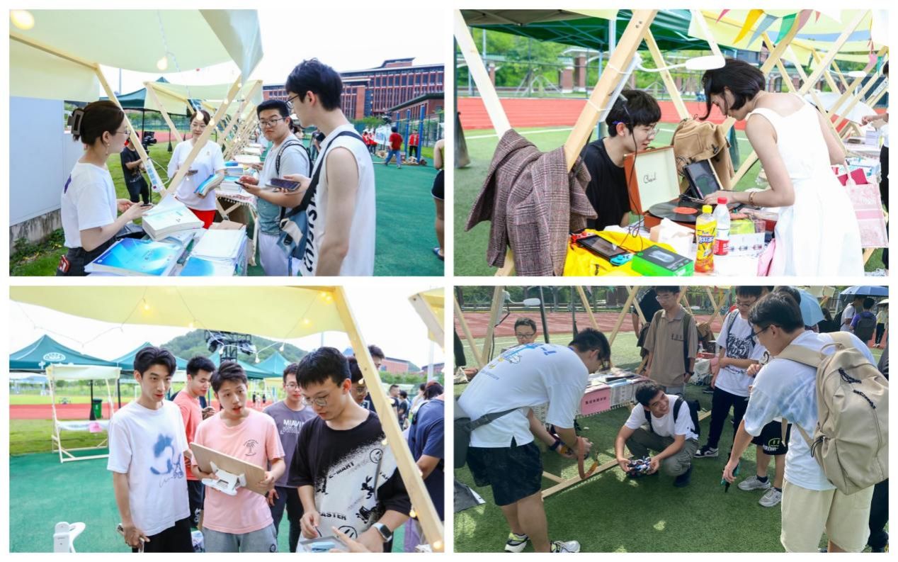集市上的攤位各具特色,醫學院的攤位上擺滿了厚厚的“藍大本”,集成電路學院向同學們展示了自研的電動小車,航空航天學院攤位上的電子設備格外受歡迎,先進能源學院的攤位負責人為同學們介紹售賣物品的特點和細節,篤行社團設計了各類周邊,大學服務中心也借此機會向校區師生宣傳無紙化辦公的綠色理念和即將上線的師生辦事新業務。