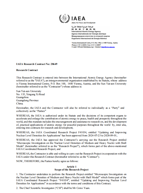 中大新聞網訊(通訊員張一桐、劉夢蘭)近日,中法核工程與技術學院核數據學科在國際核領域再次取得重要進展:以袁岑溪教授為首席科學家的科研團隊成功獲批國際原子能機構(IAEA)研究項目“基于殼模型的中重核區能級密度微觀研究”。這是中山大學在核數據領域首次獲得IAEA項目立項,為進一步提升我國在國際核科技前沿領域的影響力、助力高質量發展奠定了堅實基礎。