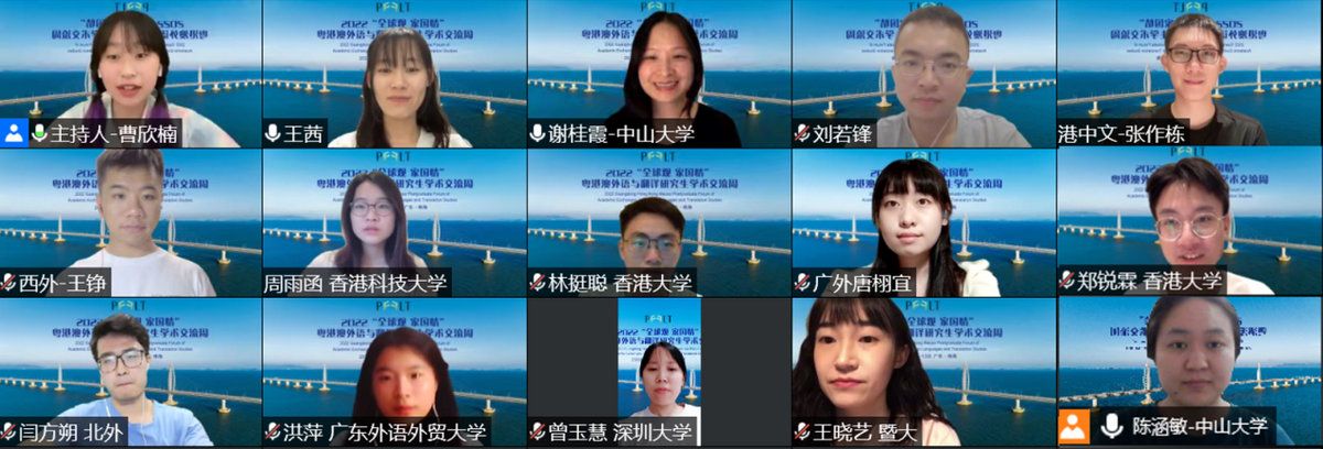 2022“全球觀 家國情”粵港澳外語與翻譯研究生學術交流周前身為粵港澳外語與翻譯研究生學術論壇,經(jīng)過七年的發(fā)展,活動不斷走向成熟,成為三地青年學子交流學術、增進友誼的橋梁。本屆學術交流周既契合粵港澳大灣區(qū)發(fā)展背景,助力粵港澳地區(qū)協(xié)同發(fā)展,也在促進粵港澳師生交流學術文化、培養(yǎng)外語人才、弘揚家國情懷方面發(fā)揮了重要作用。