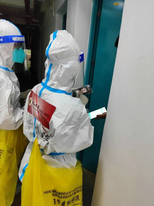 由于南校園實施“足不出戶”管理模式,隊員們需要“挨家挨戶”進行上門采樣。有的宿舍樓層最高有8層,在29℃的天氣下,隊員們穿著密不透風的防護服爬樓梯,汗流浹背,但大家心里想著師生平安健康,想著早點控制疫情,都毫無怨言。