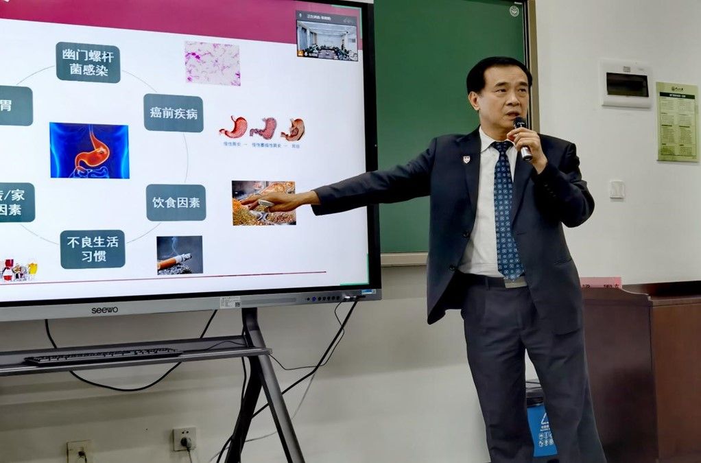 何裕隆院長以“常見腸胃疾病與消化保健”為題,以我國胃癌高發地區居民的飲食習慣為切入點,指出飲食因素、不良生活習慣、幽門螺旋桿菌感染和家族性遺傳等胃癌高危因素,介紹了目前預防和治療胃癌和降低胃癌復發的主要醫療技術手段。他提醒大家一定要養成良好的生活習慣,注意科學預防腸胃病,適時進行胃鏡檢查,及早排除潛在風險。
