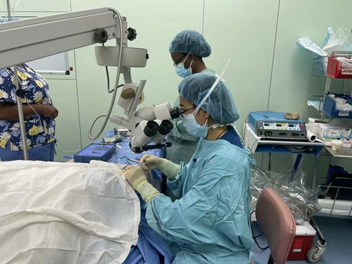 由于當地醫療資源有限,加上新冠肺炎疫情影響,盡管醫療隊努力地安排門診和手術,仍有不少白內障患者在等待救治。今年5月12日,在廣東省衛健委等多方資助和歷屆援多眼科醫生的推動下,中多友誼醫院成立了眼科中心,終于有了獨立的手術室。眼科也由原來每周一次手術,變為三次手術,大大縮短了患者等待手術的時間。段芳作為第一位在新手術室做手術的醫生,完成了多米尼克首例人工晶體雙攀固定術,成功解決患者復視的問題。
