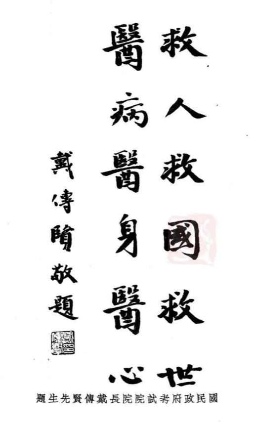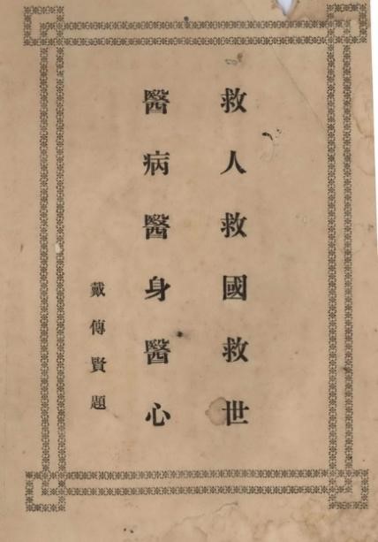的確,在新文化運動前,對聯的讀法是從右讀至左,但新文化運動后,隨著白話文的問世,對聯的讀法又遵循從左向右的次序。但從對聯撰寫的平仄要求來講,應該是仄起平回,也就是說上聯最后一個字應是仄音,下聯最后一個字應是平音。這副對聯是戴校長所撰,按他的學識修養,應該懂得遵循對聯撰寫的平仄要求。我想,這幅對聯上聯是“救人救國救世”,下聯是“醫病醫身醫心”,符合對聯仄起平回的要求。