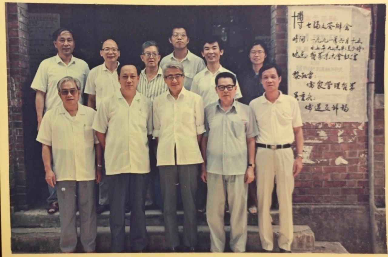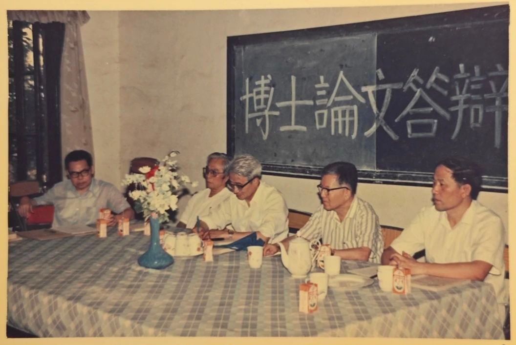 作者博士論文答辯會,從左到右分別為李錦全教授、曹礎基教授、蕭萐父教授(主席)、吳熙釗教授、姜伯勤教授(1991年6月15日)