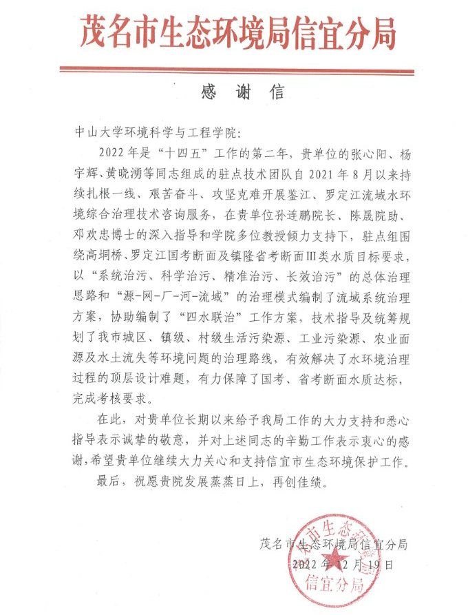 2022年高垌橋、羅定江茂名出境國(guó)考斷面全年平均水質(zhì)均從Ⅲ類提升至Ⅱ類,優(yōu)于Ⅲ類的考核目標(biāo),水環(huán)境綜合治理效果顯著,共改善鑒江、羅定江流域河道及水體長(zhǎng)度102.9公里,惠及人口67萬(wàn)余人,茂名市生態(tài)環(huán)境局信宜分局于2022年12月19日向我校環(huán)境科學(xué)與工程學(xué)院發(fā)來(lái)感謝信。