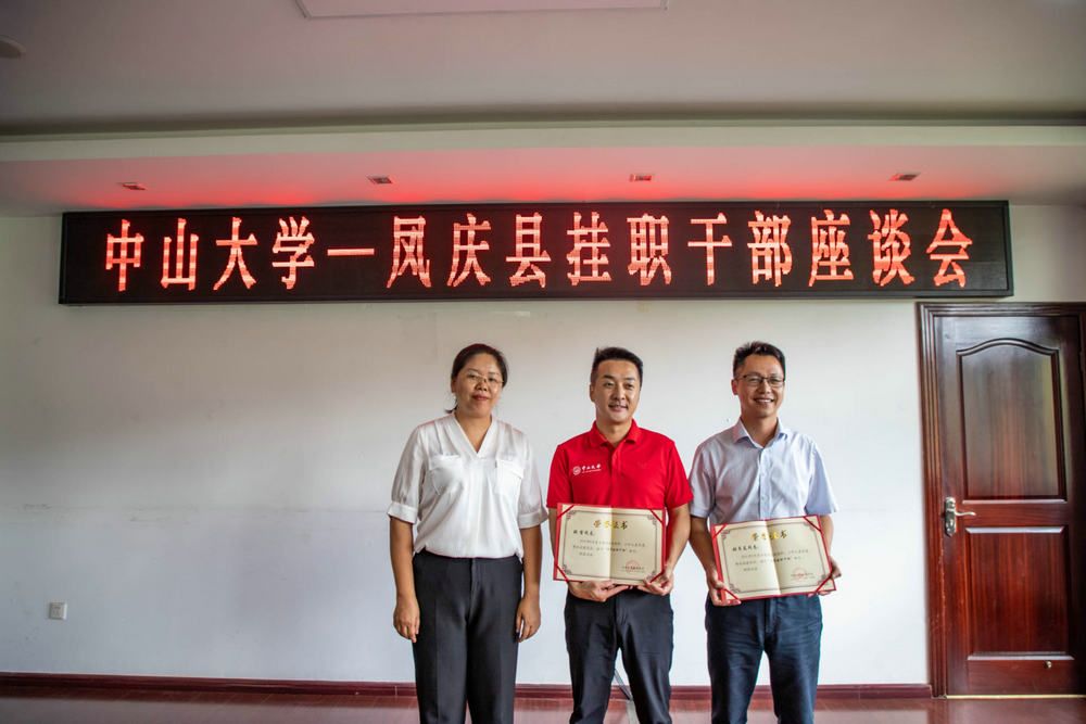 2023年是學校派駐鳳慶縣掛職干部的輪換年,學校黨委選派郭瑞同志接替張哲同志掛職鳳慶縣副縣長,選派黃鑫同志接替張良友同志掛職紅塘村駐村第一書記。在中山大學-鳳慶縣掛職干部座談會上,張哲、張良友分別對兩年的掛職幫扶工作進行了全面總結。鳳慶縣委常委、縣委組織部部長楊慧玲對他們的辛勤付出和工作成效給予充分肯定和感謝,并向兩位干部頒發了鳳慶縣“優秀掛職干部”“榮譽公民”證書。