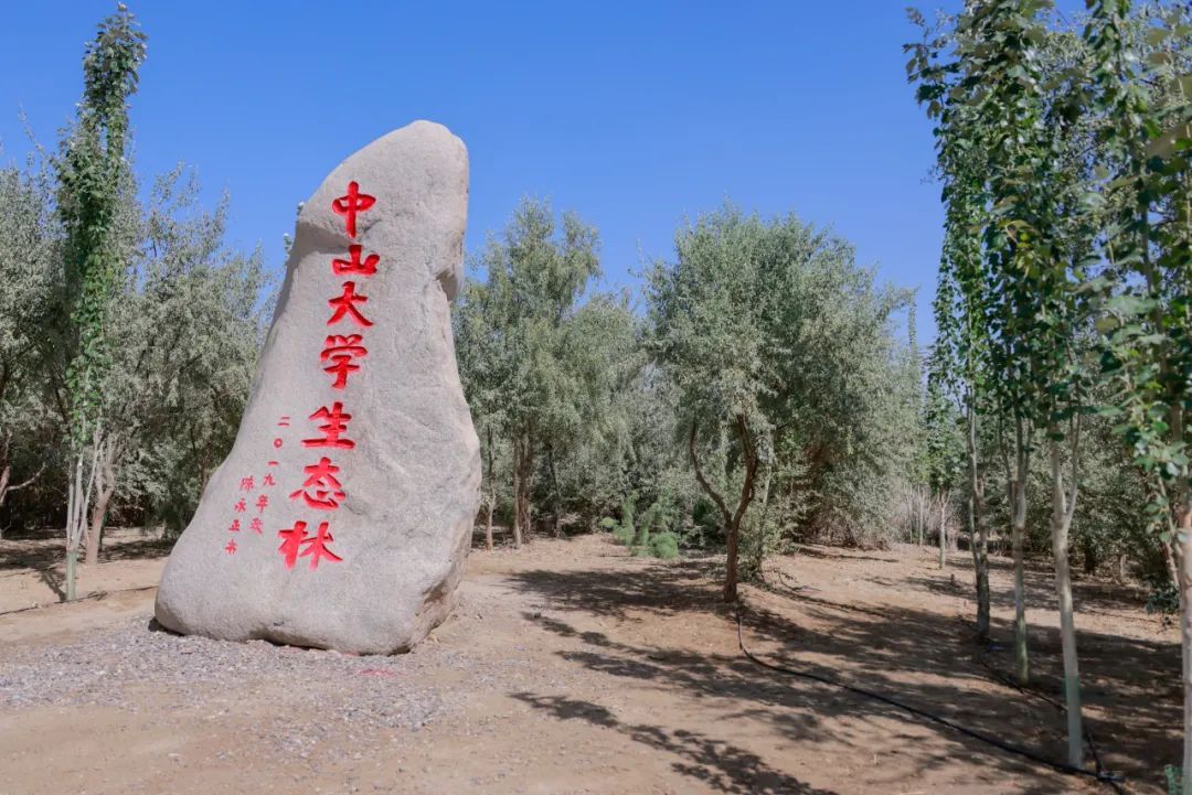 中山大學居南海之濱,與麥蓋提縣隔五千多公里遙遙相望。2019年,雙方達成共識正式簽約,中山大學捐資援助當地建設防風固沙生態林。如今,中大援助的生態林已建設完成,囊括了楊樹、沙棗、梭梭等各類苗木360萬株。一棵棵樹苗被悉心栽植,給荒漠帶來了青山綠水。