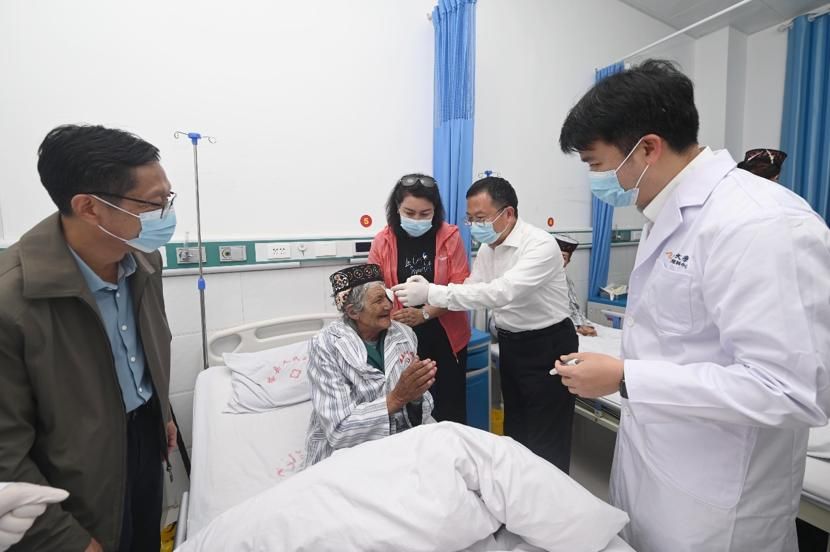 8月10日,高松校長在塔縣人民醫院為白內障患者馬合托姆·馬熱菲揭開手術眼包