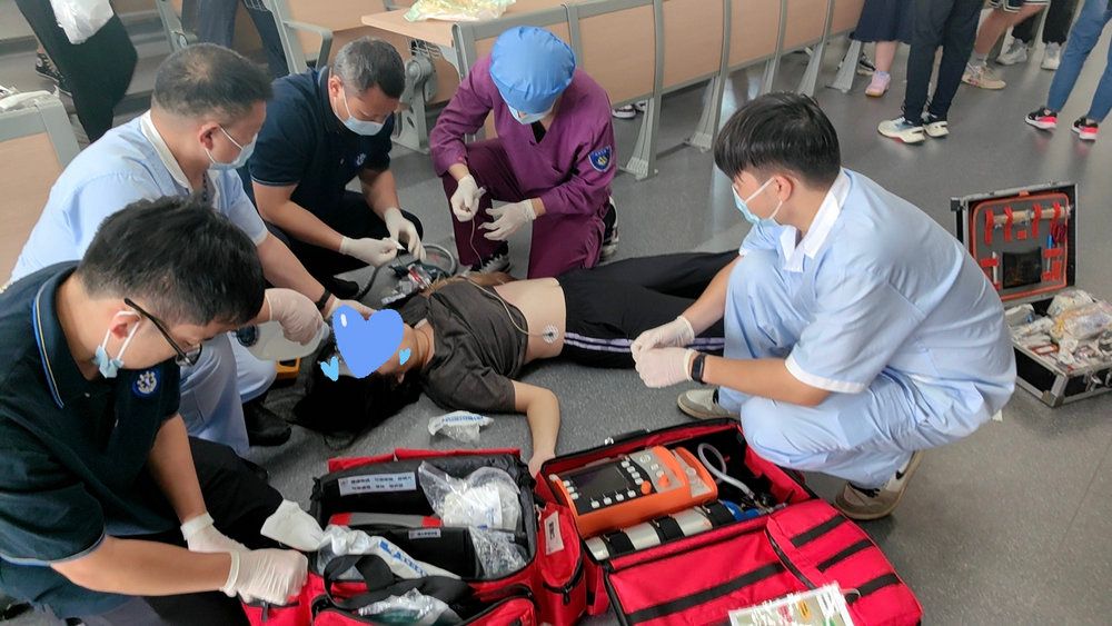 楊中漢教授報告學(xué)院領(lǐng)導(dǎo)后,根據(jù)學(xué)生出現(xiàn)心臟驟停的緊急癥狀,展開心肺復(fù)蘇搶救,心肺復(fù)蘇3個循環(huán)加一次AED除顫后,學(xué)生恢復(fù)起搏和自主呼吸,約10分鐘120救護人員到位,及時將學(xué)生送到附屬第七醫(yī)院救治。