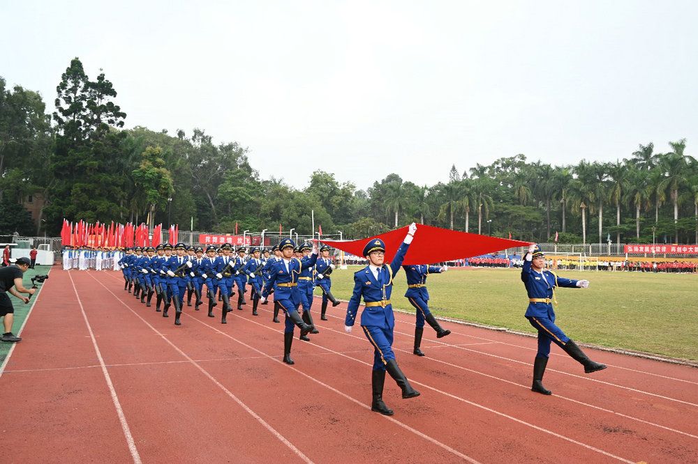 莊嚴(yán)的升旗儀式在嘹亮的國(guó)歌聲中舉行。國(guó)旗護(hù)衛(wèi)隊(duì)的同學(xué)們身著戎裝,邁著鏗鏘有力的步伐,護(hù)送著鮮艷的五星紅旗正步走向升旗臺(tái)。參加本屆運(yùn)動(dòng)會(huì)近4000名師生面向國(guó)旗肅立致敬,注視著五星紅旗冉冉升起。