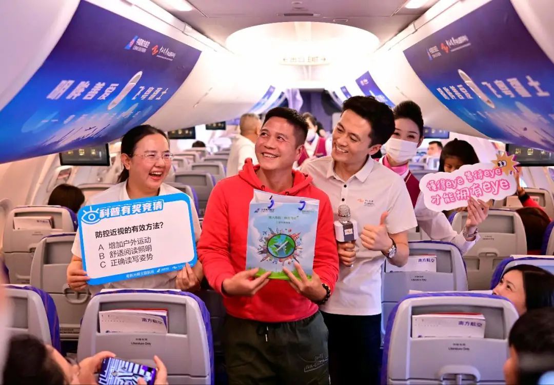 飛機(jī)進(jìn)入平飛狀態(tài)后,客艙變身為大型空中眼科保健課堂,兩位援疆醫(yī)生向旅客介紹眼科保健知識,機(jī)上乘客通過精心特制的眼鏡,模擬體驗(yàn)不同眼部疾病的狀況以及由此帶來的不便。現(xiàn)場在熱鬧的搶答和互動(dòng)講解中,乘客們掌握了專業(yè)的眼保健的常識,同時(shí)還深入了解了中山大學(xué)中山眼科中心牽頭實(shí)施“粵新光明行”的重要意義。機(jī)上科普活動(dòng)提高了公眾對眼睛的認(rèn)知和理解,讓更多人關(guān)注到身處西域邊陲患有白內(nèi)障等常見致盲眼病的患者。
