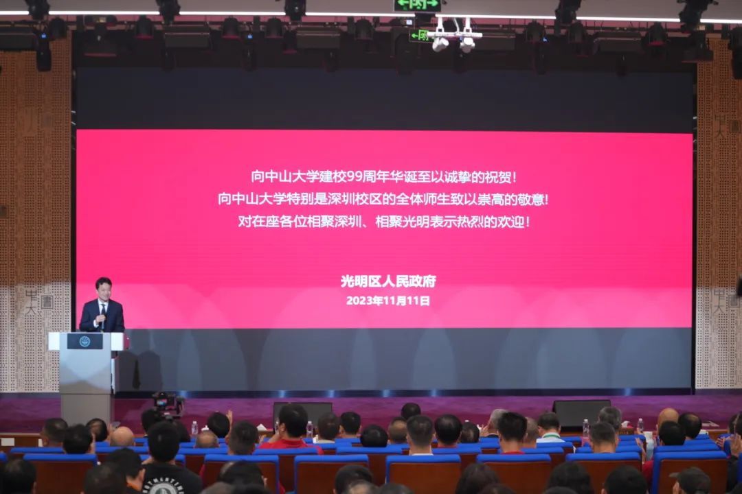 深圳市光明區(qū)委副書記、區(qū)長(zhǎng)邱浩航進(jìn)行大會(huì)致辭。邱浩航代表深圳市光明區(qū)向中山大學(xué)99周年校慶致以誠(chéng)摯的祝賀,向參會(huì)校友相聚深圳表示熱烈歡迎。邱浩航表示,目前中山大學(xué)深圳校區(qū)已經(jīng)成為推動(dòng)深圳經(jīng)濟(jì)社會(huì)高質(zhì)量發(fā)展、支撐光明科學(xué)城建設(shè)的重要科研區(qū)和人才的培養(yǎng)中心。邱浩航向大家介紹了光明區(qū)的發(fā)展規(guī)劃,期待未來與中山大學(xué)更多的合作與交流。