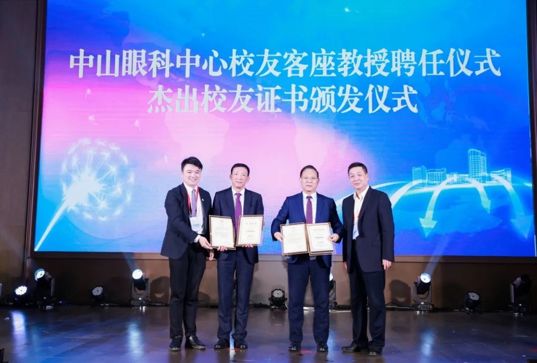 中山眼科中心的發(fā)展,離不開前輩老師們的辛勤耕耘,也離不開校友們一直的支持和反哺。會上,舉辦了中山眼科中心校友客座教授聘任儀式、杰出校友證書頒發(fā)儀式,蒞臨現(xiàn)場的兩位非常杰出的眼科中心校友、眼科學(xué)屆的大咖——1987級眼科學(xué)校友楊培增教授以及1988級眼科學(xué)校友劉祖國教授,上臺接受聘書和證書。