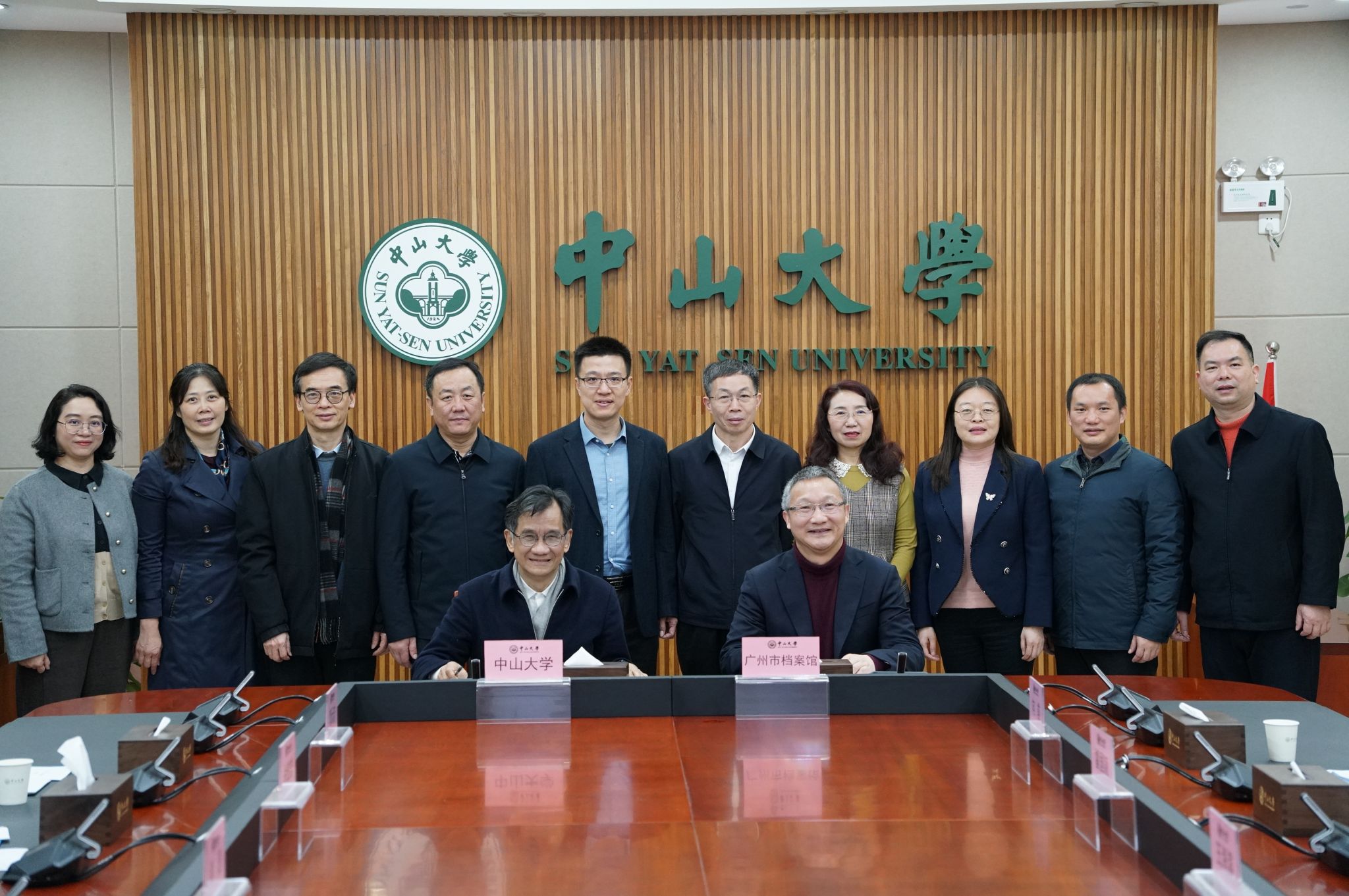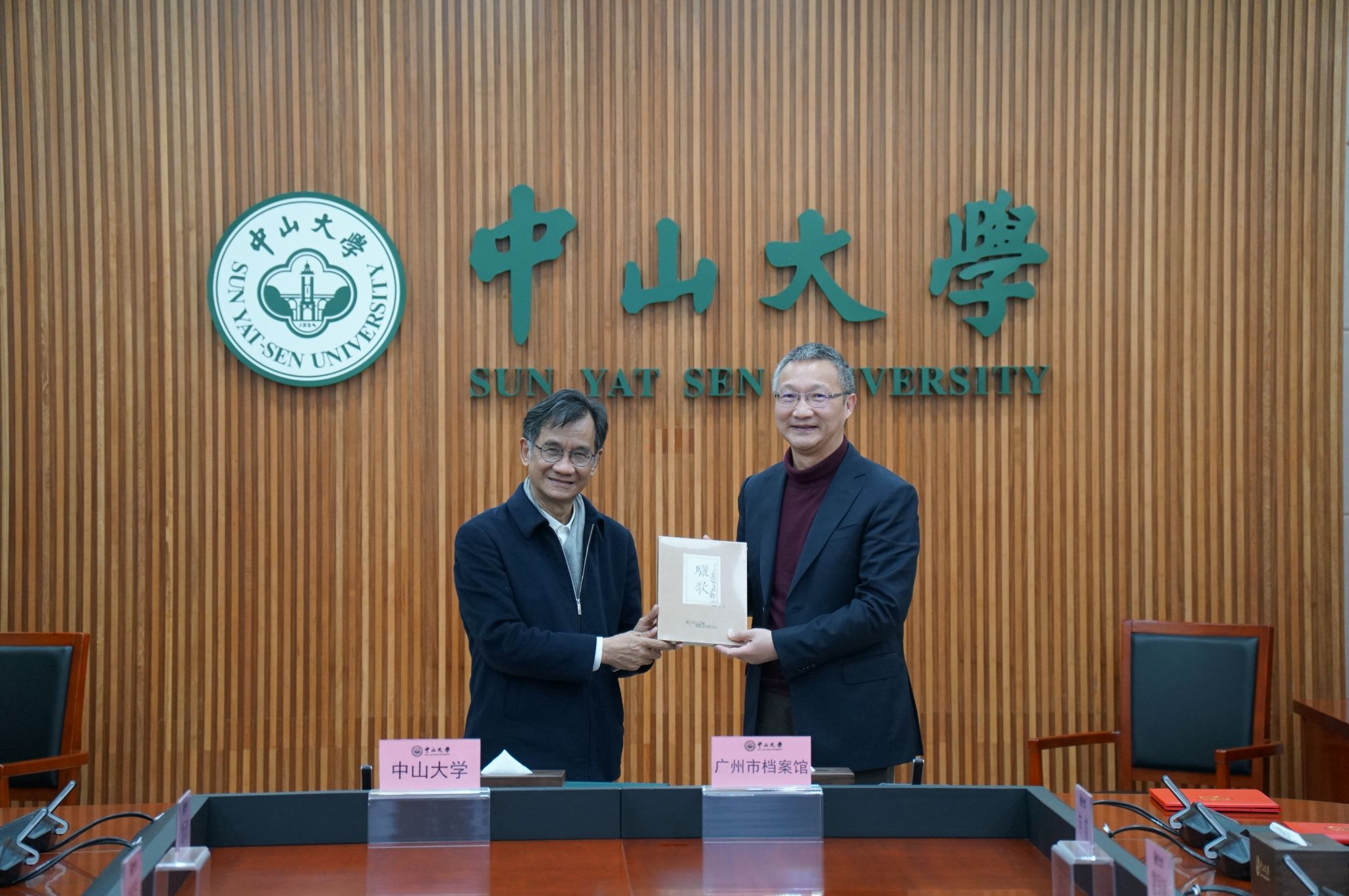協(xié)議由廣州市檔案館館長王海濱、中山大學(xué)博物館(校史館)館長徐俊忠代表簽署。中山大學(xué)副校長謝湜、廣州市檔案館副館長蔣年平、中山大學(xué)校史研究專家曹天忠教授、中山大學(xué)文獻與文化遺產(chǎn)管理部主任王天琪、博物館(校史館)副館長勞楚華等,一起見證簽約儀式。