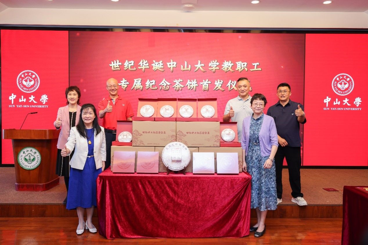 交流會后,舉行了“世紀華誕中山大學教職工專屬紀念茶品首發儀式”。紀念茶餅來自著名的滇紅之鄉——學校定點幫扶的云南省鳳慶縣,飽含當地干部群眾對學校全體師生的美好祝愿,象征著校地雙方11年來的深厚情誼。
