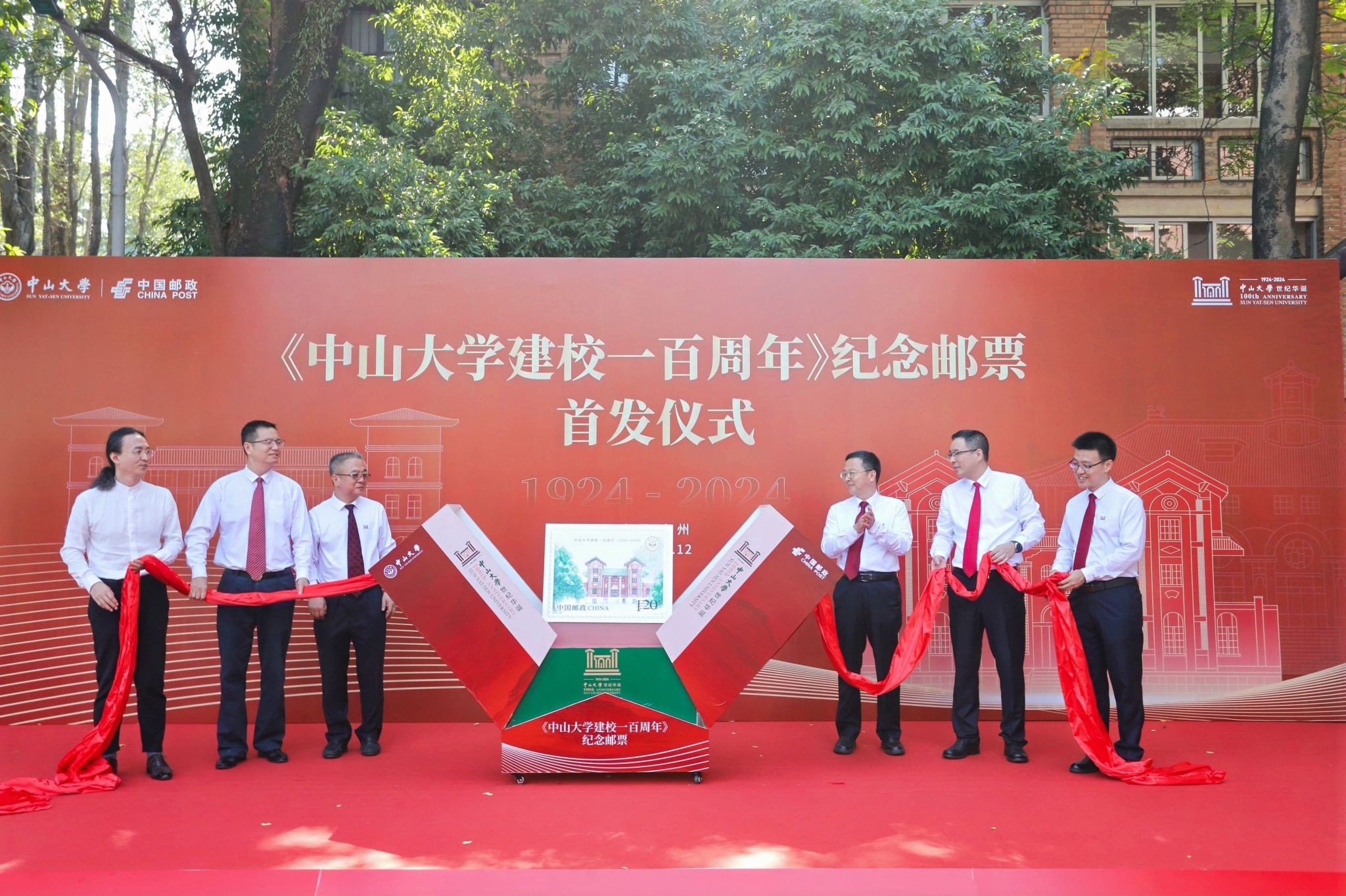 中山大學校長高松、中山大學常務副校長楊清華、中國郵政集團有限公司廣東省分公司總經理陳洪濤、廣東省郵政管理局副局長羅德韶和《中山大學建校一百周年》郵票設計師張強博士共同為《中山大學建校一百周年》紀念郵票揭幕