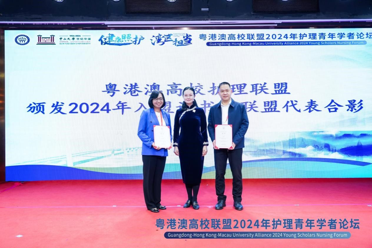 開幕式現場,張琪副書記為2024新入盟的兩所高校,香港東華學院和嘉應學院醫學院代表頒發證書。