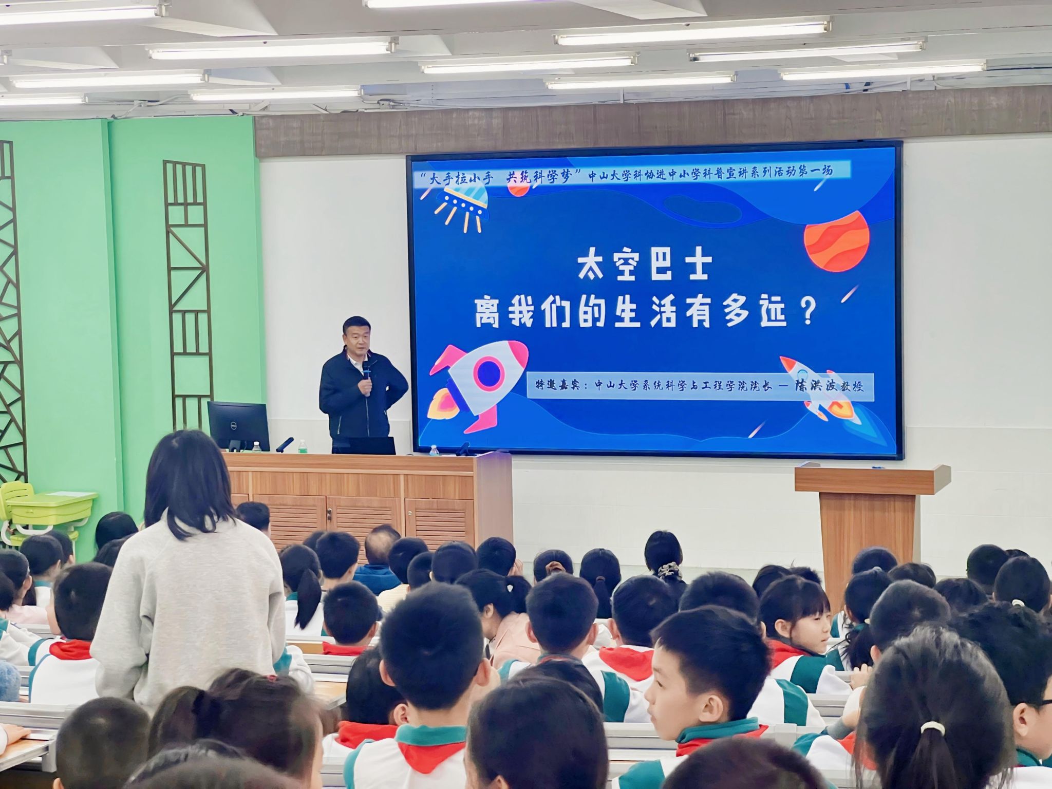 3月19日下午,首場講座在中山大學附屬小學開展,系統科學與工程學院院長陳洪波教授以“太空巴士離我們的生活有多遠”為主題開講。