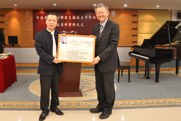 許伯夷先生(左)向我校陳春聲常務副書記、副校長(右)捐贈黃友棣校友早年作曲真跡原件資料