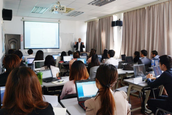 商務漢語大四年級的留學生正聽著《商務應用基礎》課,授課老師納賽爾也是國際漢語學院的畢業生