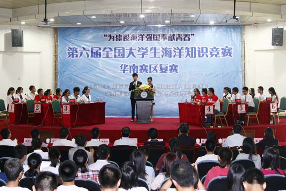 10月24日,第六屆全國大學生海洋知識競賽華南賽區復賽在中山大學珠海校區舉行,本屆競賽活動以“為建設海洋強國奉獻青春”為主題開展。來自中山大學、廣東海洋大學、廣西中醫藥大學、廈門大學、集美大學和昆明理工大學等學校的六支代表隊爭奪華南賽區的冠軍。國家海洋局宣傳教育中心陳寧,珠江口中華白海豚國家級自然保護區管理局局長古錫純,海洋出版社副社長牛文生,海洋出版社《海洋世界》雜志主編閻安,我校海洋學院黨總支書記陳省平、珠海校區黨工委副書記林俊洪、珠海校區黨政辦主任胡海峰,珠海市容閎小學師生及我校海洋學院師生出席比賽活動現場。