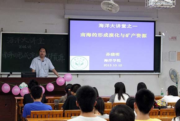 10月10日晚,由海洋學院舉辦的海洋大講堂2013年第一講在珠海校區教學樓舉行,講座題目為“南海的形成演化與礦產資源”,主講嘉賓為孫曉明教授。
