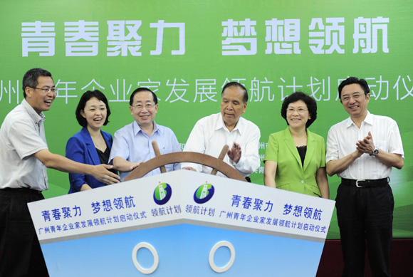 (從左到右)祁斌主任、曾穎如書記、鄭德濤書記、陳開枝副會長、貢兒珍副市長和趙南先副秘書長共同開啟“廣州青年企業家發展領航計劃”之舵