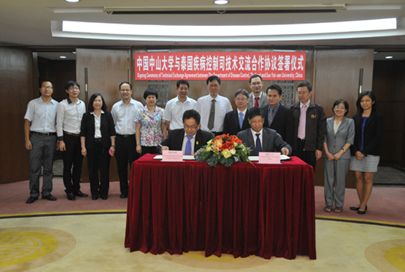 泰國公共衛(wèi)生部疾病控制司DR. PORNTEP SIRIWANARANGSUN司長(zhǎng)(前排左)與我校魏明海副校長(zhǎng)(前排右)簽署技術(shù)交流合作協(xié)議書