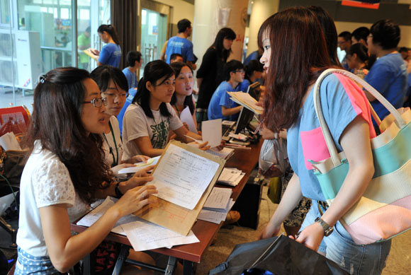 本科新生黨員、國防生和外國留學生于8月12日首批報到。報到當天,迎新人員熱情服務,確保每位新生都有專人引路,幫忙搬運行李,負責解疑答惑。高年級國防生與新生結成對子,了解他們的思想狀況,幫助他們排憂解難。校團委與東校區學生會特意為新生黨員舉辦了系列培訓講座,讓他們分享前輩的人生閱歷、提高黨員覺悟、感受校園的文化氛圍。外國留學生辦公室則請來農業銀行、保險公司、照相館在報到現場設點,使學生當場就可以完成入學登記、住宿安排、繳費、照相、領取簽證材料及入院系報到通知書等流程。