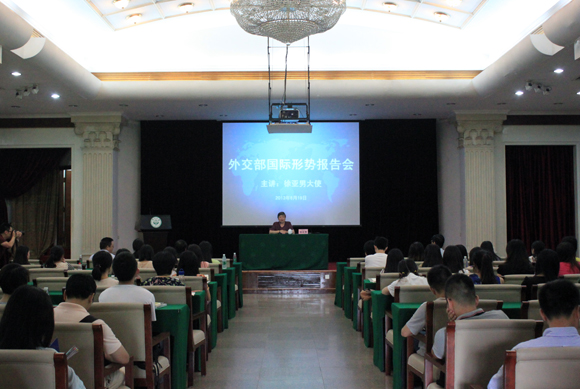 徐亞男大使在懷士堂為師生作了國際形勢專題報告。他分析了當(dāng)前國際形勢的總體情況和發(fā)展趨勢,闡述了我國對外工作現(xiàn)狀和外交工作的方針政策;著重分析了中美、中俄、中歐關(guān)系和中國的周邊外交形勢,特別通過列舉我國在處理朝鮮半島問題上的外交斡旋和努力,讓同學(xué)們更加清楚地了解我國在維護世界和平和促進世界發(fā)展中發(fā)揮的重要作用。同時,徐亞男大使結(jié)合自己多年來在特立尼達和多巴哥等國外交工作中的親身經(jīng)歷,向廣大畢業(yè)生闡述了要成為一名優(yōu)秀的外交官應(yīng)具備的素質(zhì)和能力。他鼓勵大學(xué)生要有志向投身于祖國的外交事業(yè)中去,為祖國的發(fā)展貢獻自己的一份力量。
